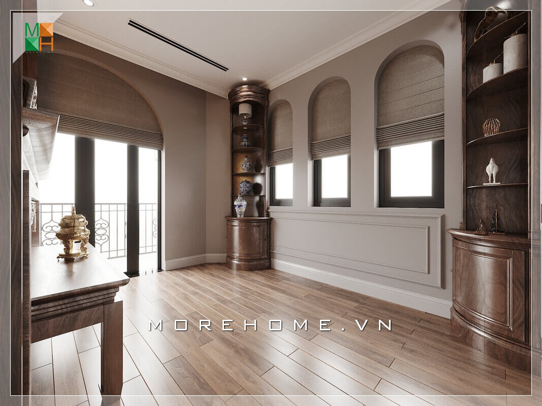 Thiết kế phòng thờ đẹp theo phong cách tân cổ điển và hiện đại nhưng vẫn giữ được nét tâm linh thờ phụng, màu nâu trầm của gỗ óc chó tự nhiên toát lên vẻ sang trọng và trang nghiêm.