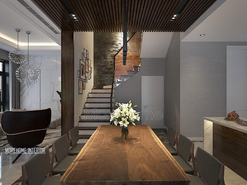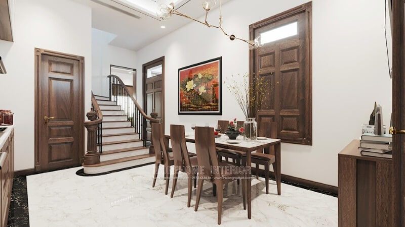 Thiết kế phòng ăn gần kề cầu thang gỗ