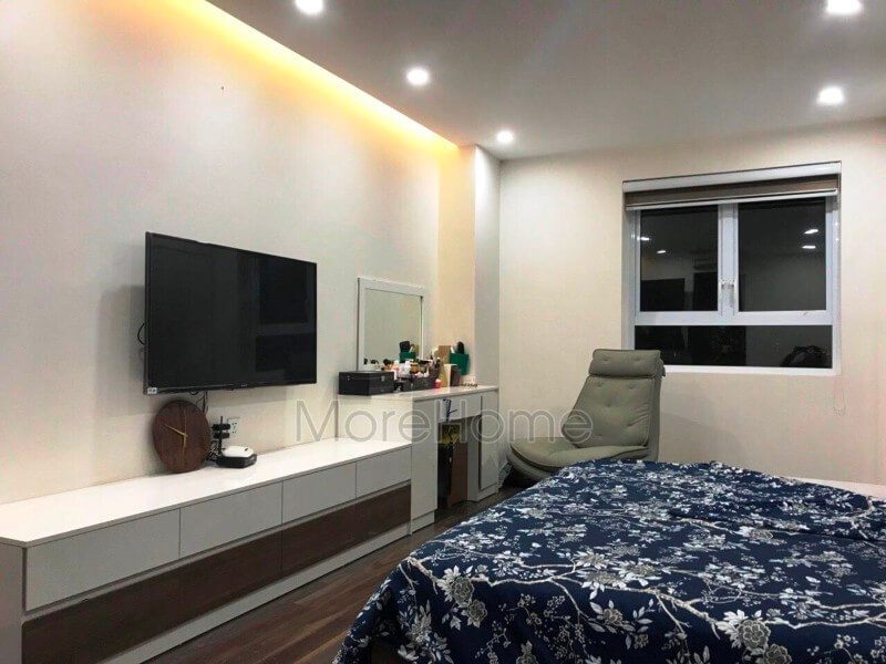 Công trình sản phẩm thi công kệ tivi hiện đại bằng gỗ công nghiệp tại phòng ngủ chung cư Thăng Long Number One Hà Nội