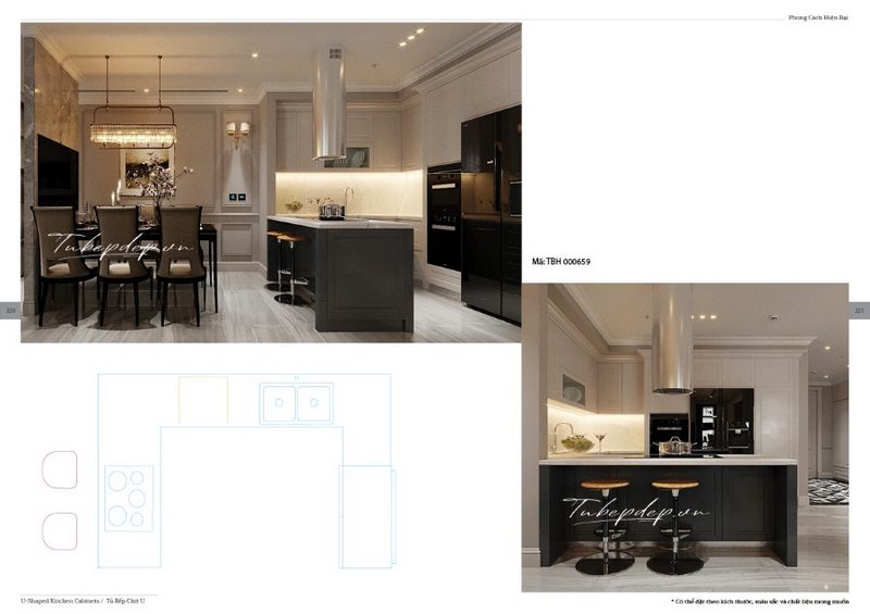 Thiết kế phòng bếp liền phòng ăn theo phong cách tân cổ điển đầy nghệ thuật nhưng được tối giản nhiều chi tiết nên vẫn thoáng đãng và gần gũi