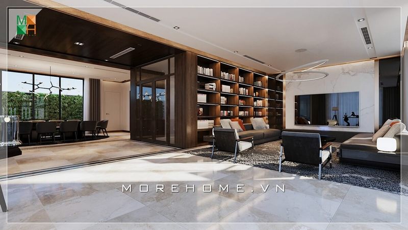 Mẫu thiết kế nhà biệt thự, phòng khách với nội thất gỗ óc chó cao cấp giúp tạo nên không gian rộng lớn, sang trọng và thoáng đãng.