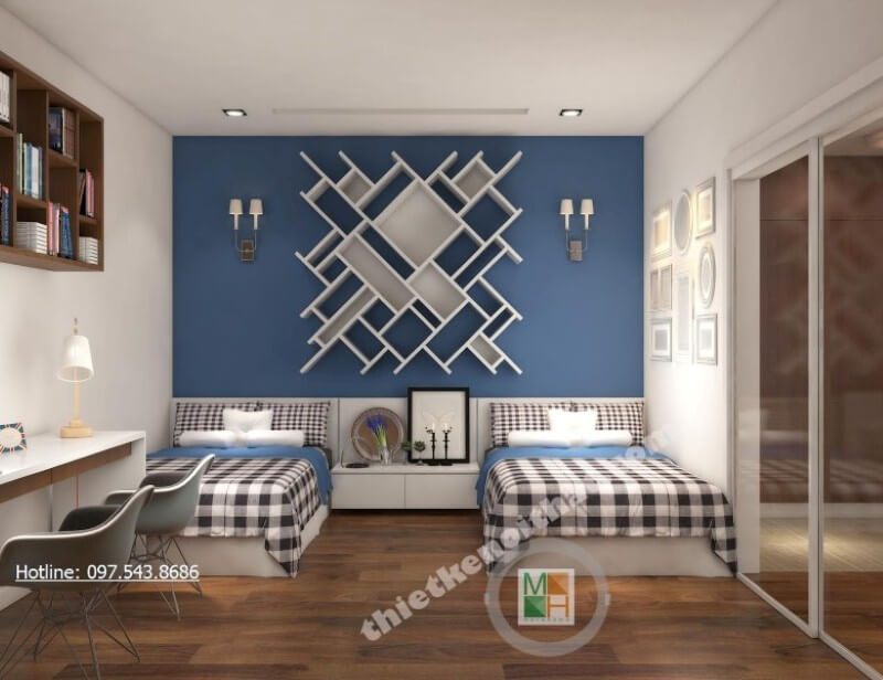 Kiến trúc sư thiết kế nội thất phòng ngủ hiện đại cho căn hộ chung cư cao cấp, sử dụng màu trắng để tạo ra một cảm giác trẻ trung và sang trọng.